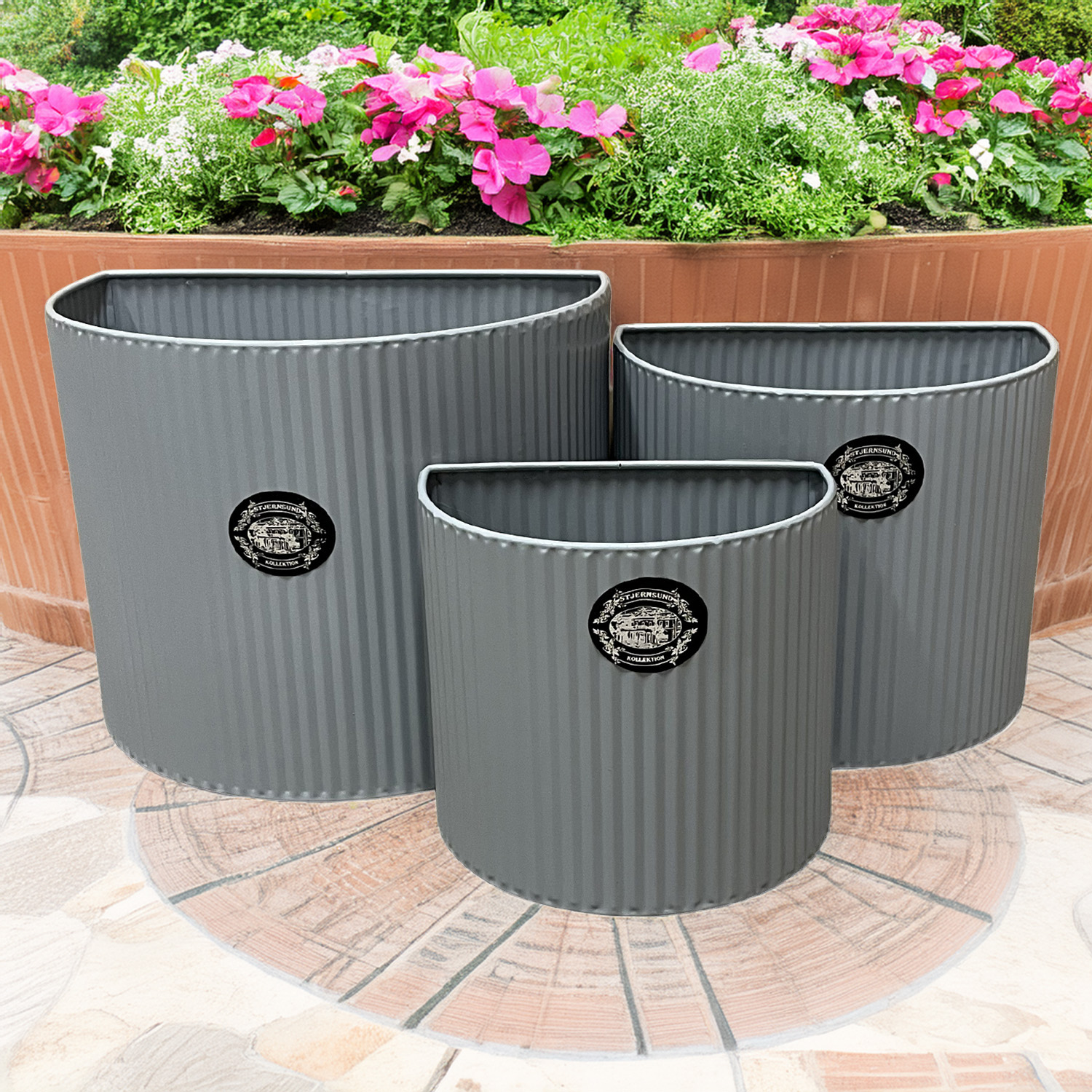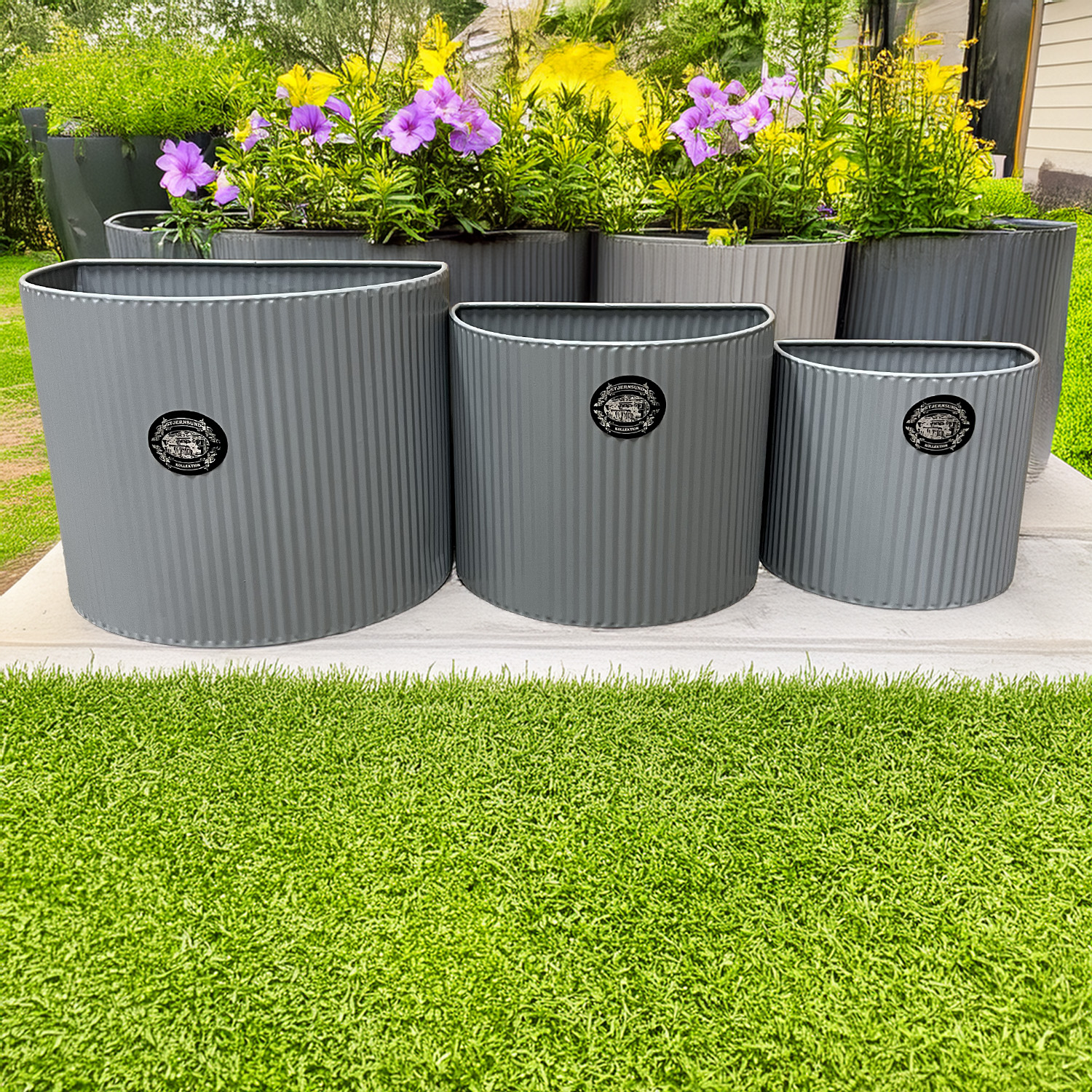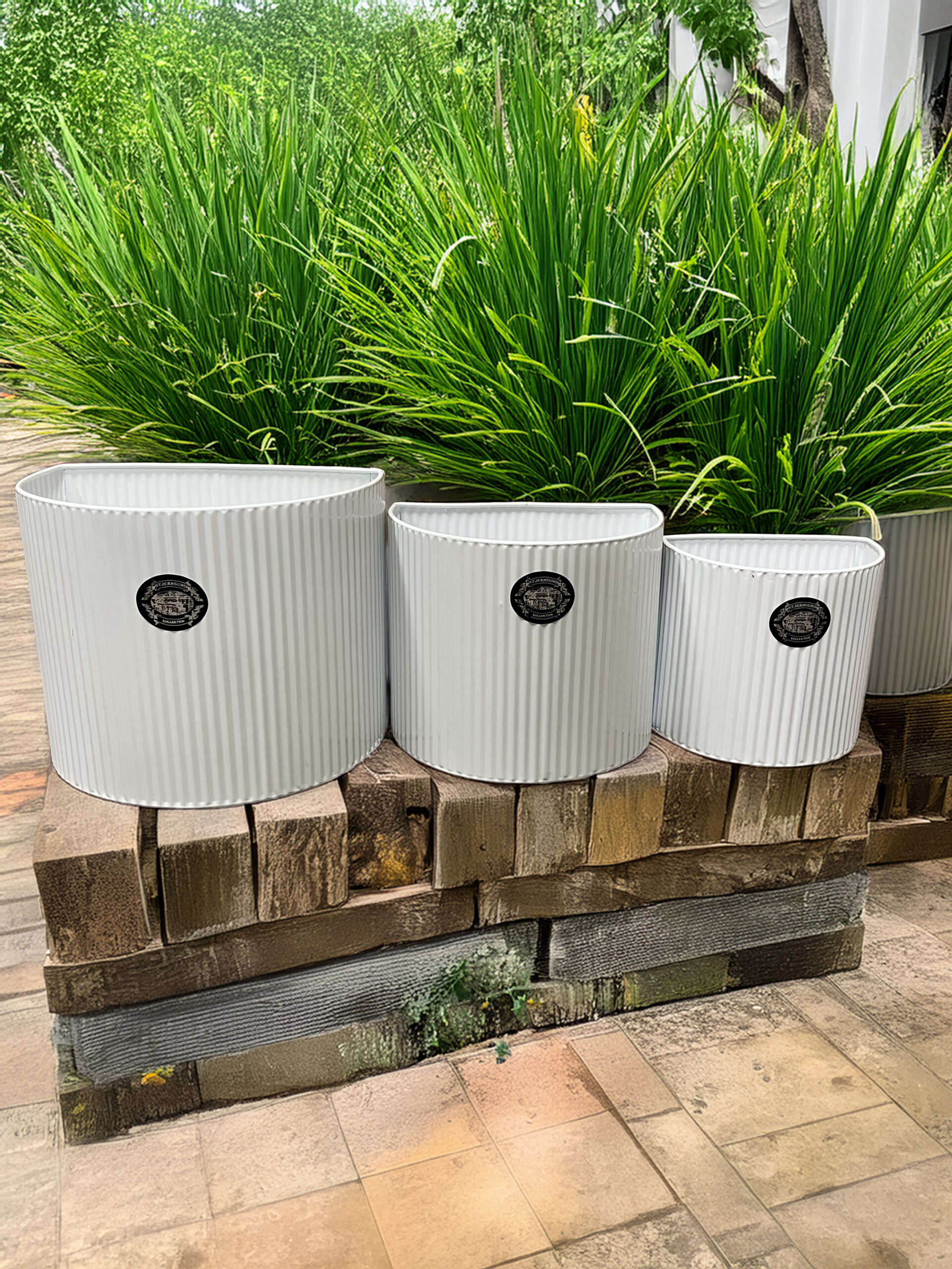 Detta stilrena set med tre blomkrukor i plåt ger dig ett enkelt sätt att skapa en levande och personlig miljö i både hem och uterum. Den räfflade ytan och den mjukt ovala formen ger ett modernt men samtidigt tidlöst uttryck som passar lika bra i köket som i vardagsrummet, på balkongen eller i hallen. Blomkrukorna levereras i tre olika storlekar och skapar en harmonisk helhet när de placeras tillsammans. Du kan använda dem stående på en hylla eller bänk, men de är även anpassade för att hängas upp på väggen. Det gör dem perfekta för dig som vill skapa en grön vägg med örter, små växter eller dekorativa arrangemang. Den vita lackerade plåten ger ett fräscht och ljust intryck och gör krukorna enkla att matcha med andra inredningsdetaljer. Materialet är lätt men samtidigt stabilt, vilket gör dem smidiga att flytta och möblera om efter säsong och stil. Med detta 3-pack får du ett flexibelt inredningselement som snabbt lyfter rummet och ger plats för både växter och kreativ dekoration. En perfekt lösning för dig som vill kombinera funktion och form på ett enkelt sätt.
